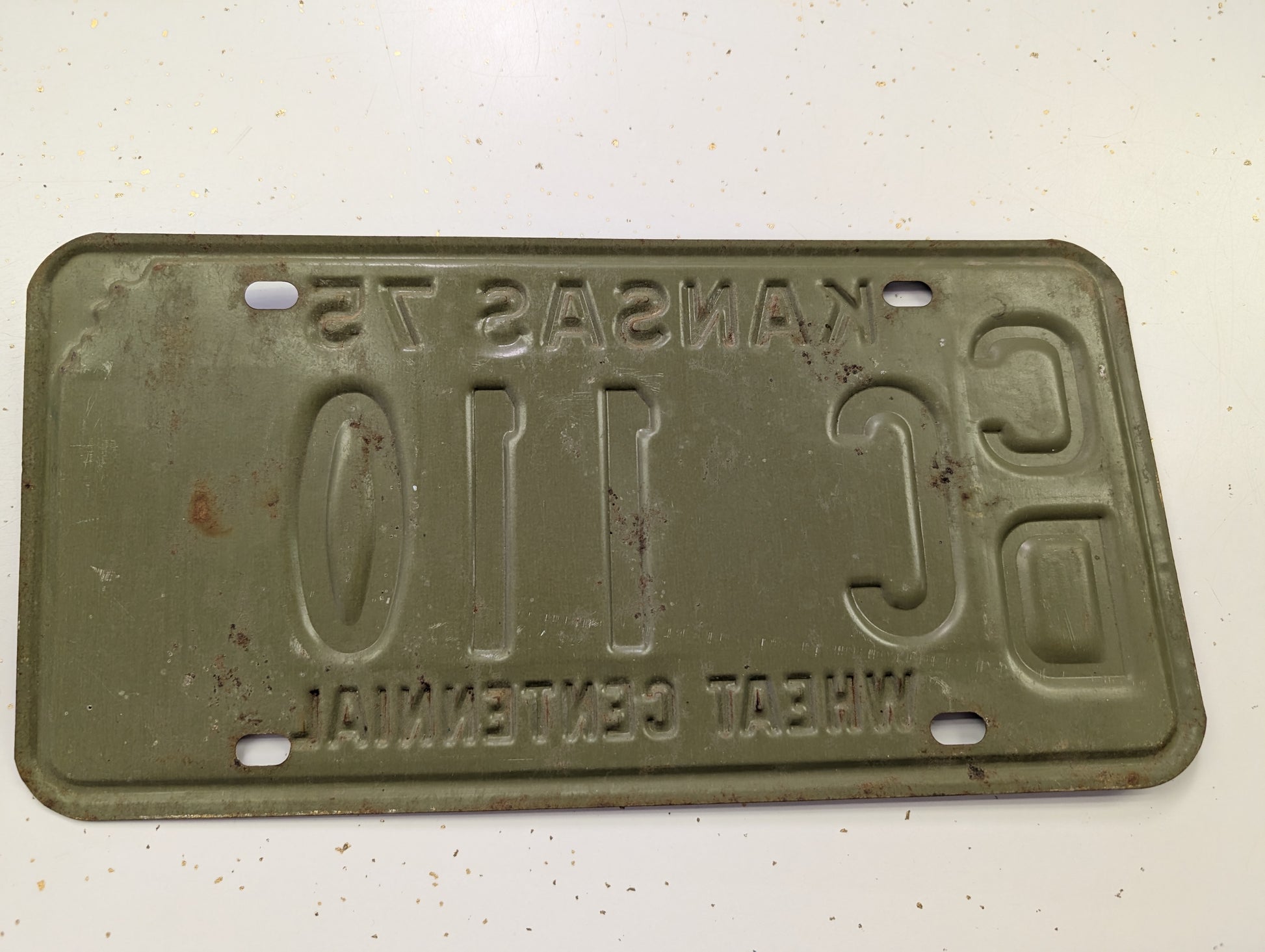 1975 Green License Plate - "Wheat Centennial" This tag is in good condition with a moderate rust.