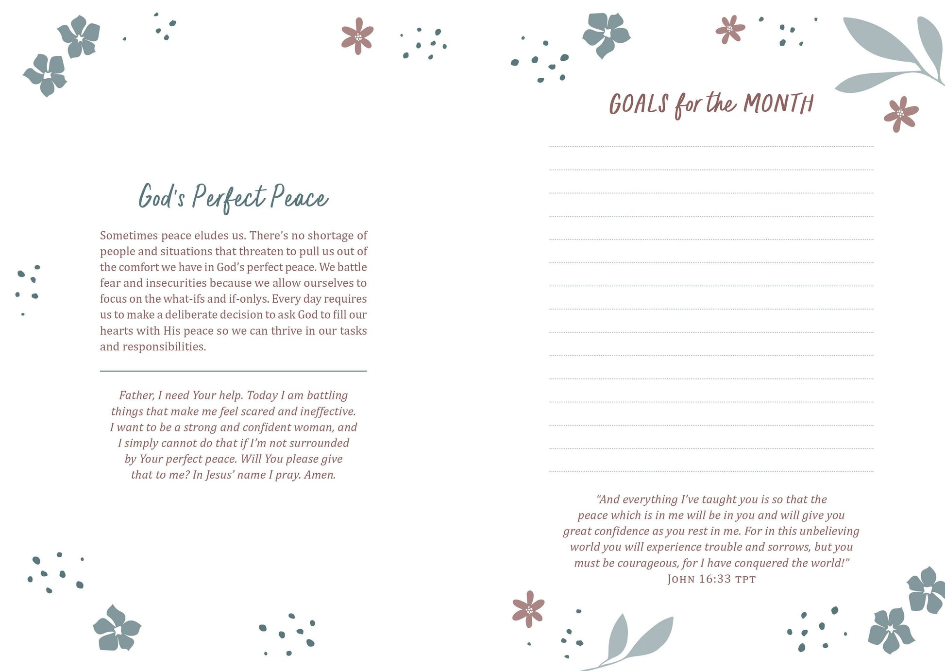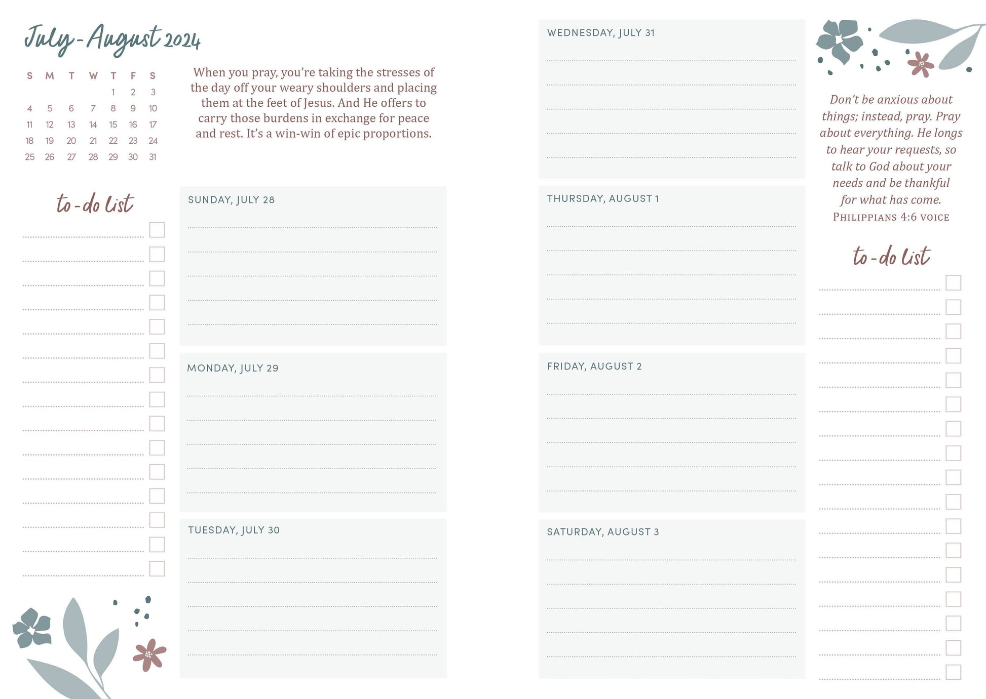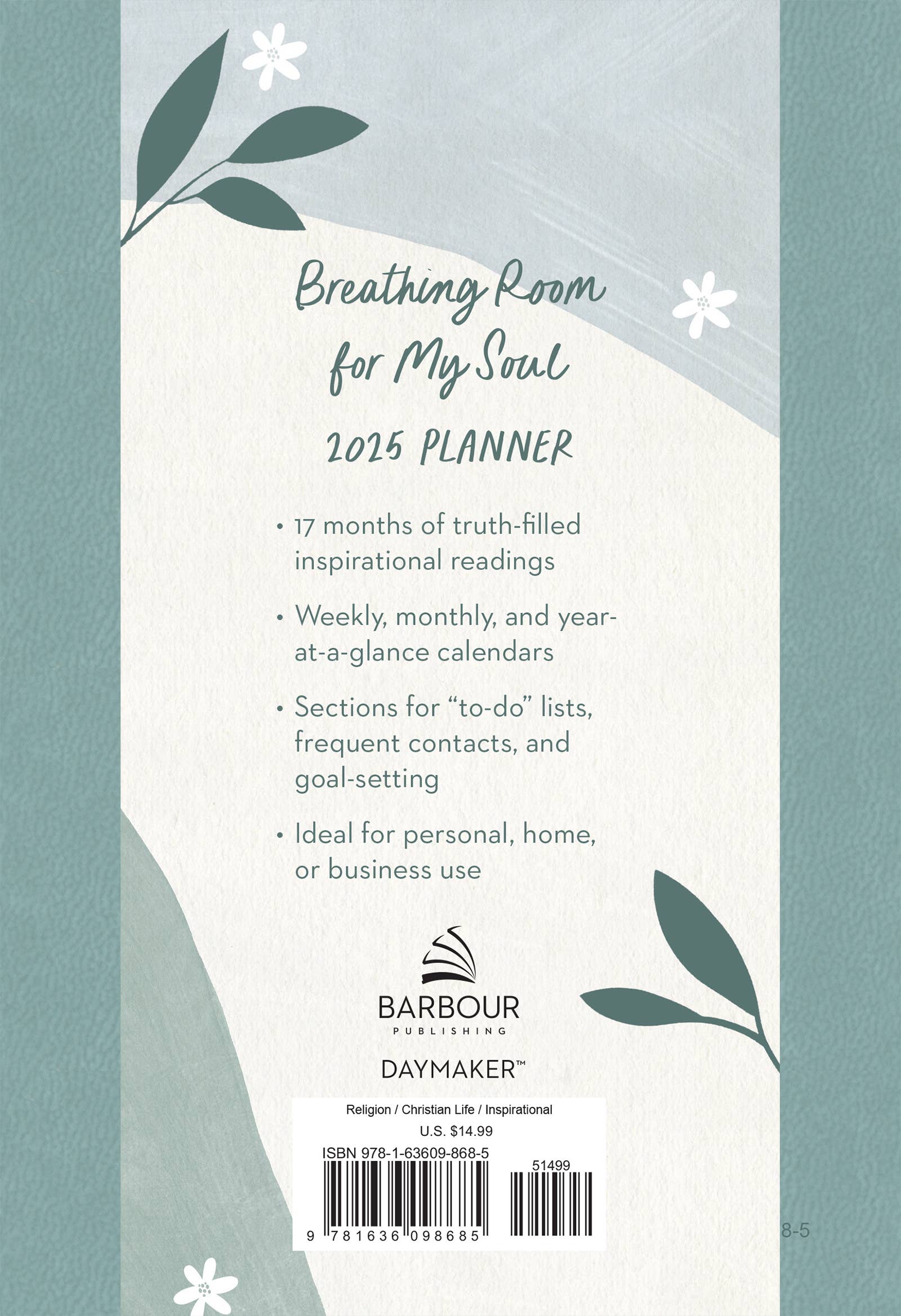 Ideal for personal, business, or school use, this Breathing Room for My Soul 17-month planner includes uplifting, truth-filled monthly devotional readings, plus faith-building scripture selections and devotional-like thoughts for every week of the year. Featuring monthly and weekly calendars, a year-at-a-glance section, pages for frequent contacts, and more, this planner offers an important reminder for your lovely heart: when the world feels like it's closing in, when the stresses of life threaten to stifle your contentment and steal your joy. . .there is one who offers breathing room for your soul—and His name is Jesus.