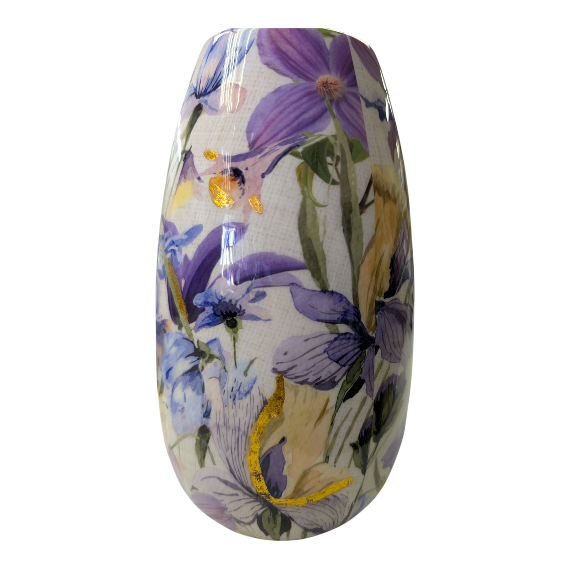 Periwinkles, bluebells and dragonflies adorn this metal vase in lovely hues of lavender, purple and yellow with strokes of gold giving it a whimsical and elegant look. Perfect for spring and summer decor where you need a touch of color. Because it is metal, but looks like porcelain, it can be used in so many more places.