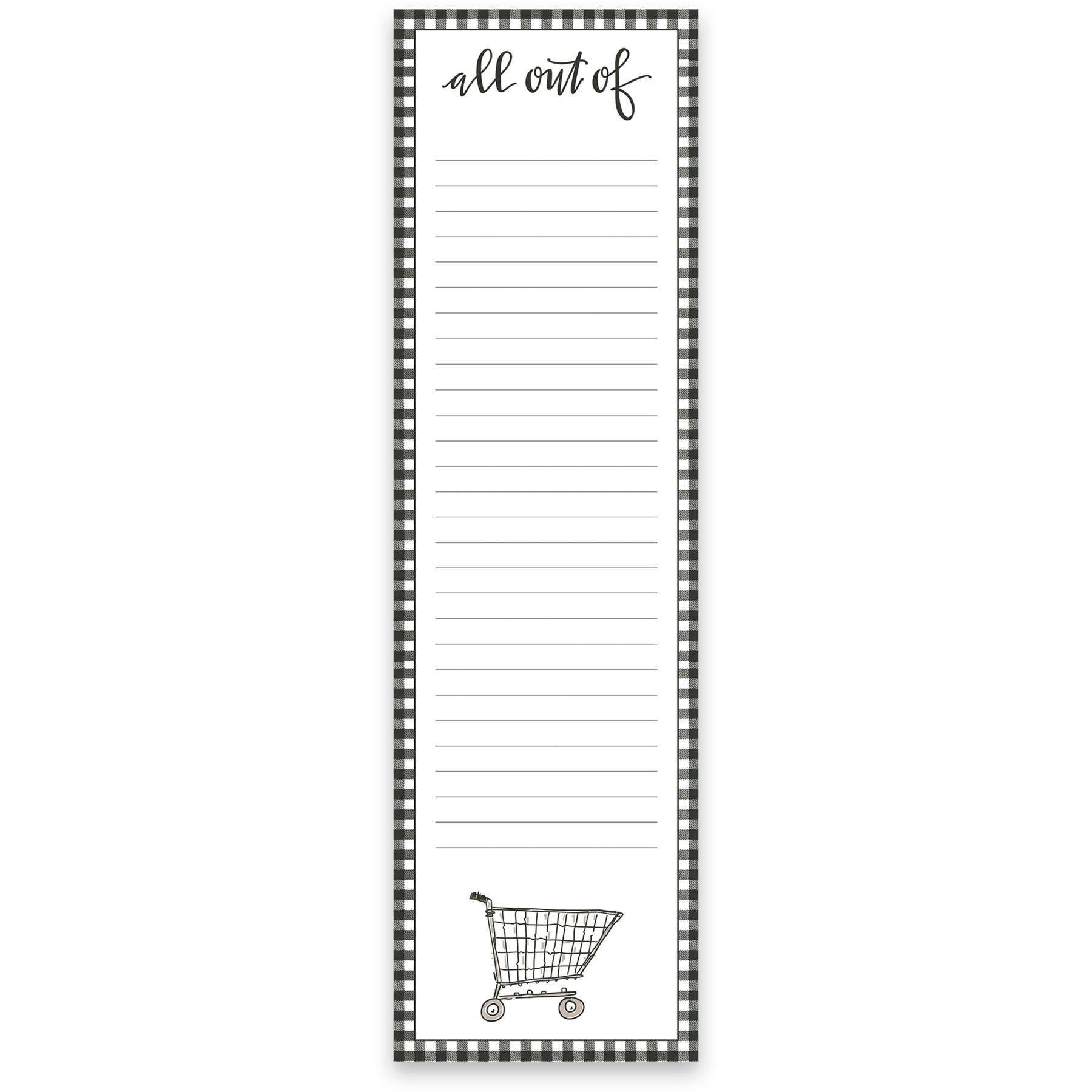 Keep track of your shopping needs in style with this hand-lettered “All Out Of” notepad—perfect for quick lists and reminders. Designed with a crisp white background, easy-to-use black lines, and a charming shopping cart at the bottom, it’s both practical and eye-catching. The classic black-and-white checkered border adds a farmhouse touch that fits any kitchen décor.