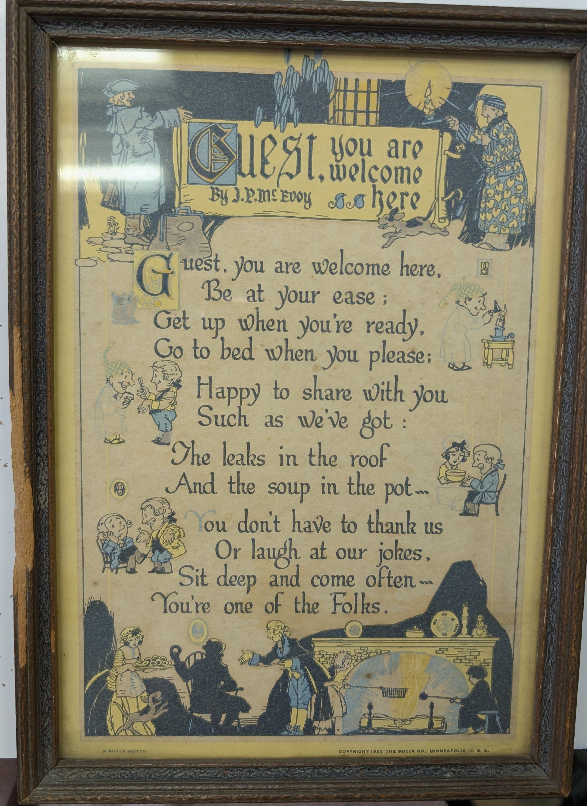 Step back in time with this charming 1925 Buzza Motto print titled "Guest, You Are Welcome Here," written by J.P. McEvoy. Published by the Buzza Company—famous for their heartfelt mottos and nostalgic artwork—this piece radiates warmth and hospitality.