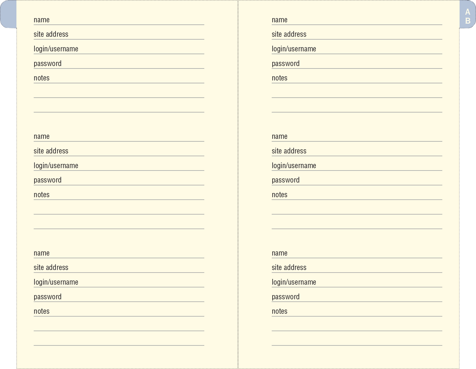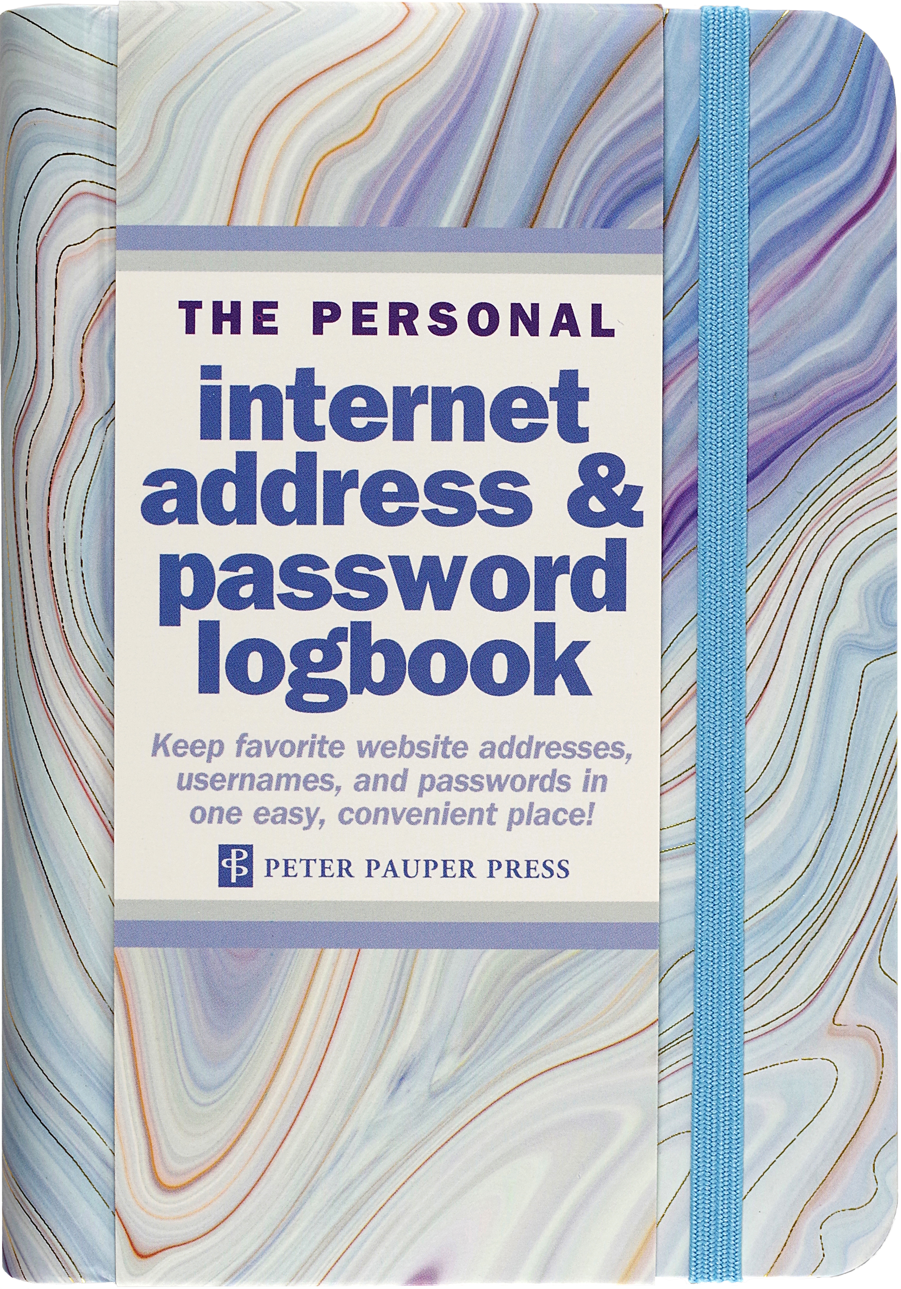 Tired of losing track of the websites you visit, along with all those usernames and passwords? Now you can keep them all in one convenient place! This time- and headache-saving little volume is organized with tabbed A to Z pages, with space on each page to write down websites, usernames, passwords, and extra notes. You can also make notes about home network configurations, software license numbers, etc., in pages in the back of the book. Removable cover band / label makes logbook discreet. Matching elastic closure keeps your place or keeps logbook closed. Beautiful agate cover design replicates the many shades of blue, amethyst, and ivory found in variegated quartz. Design is embellished with gold foil. Logbook makes an attractive and practical accessory for home or office. Concealed wire-o binding. Logbook measures 4-1/4'' wide x 5-3/4