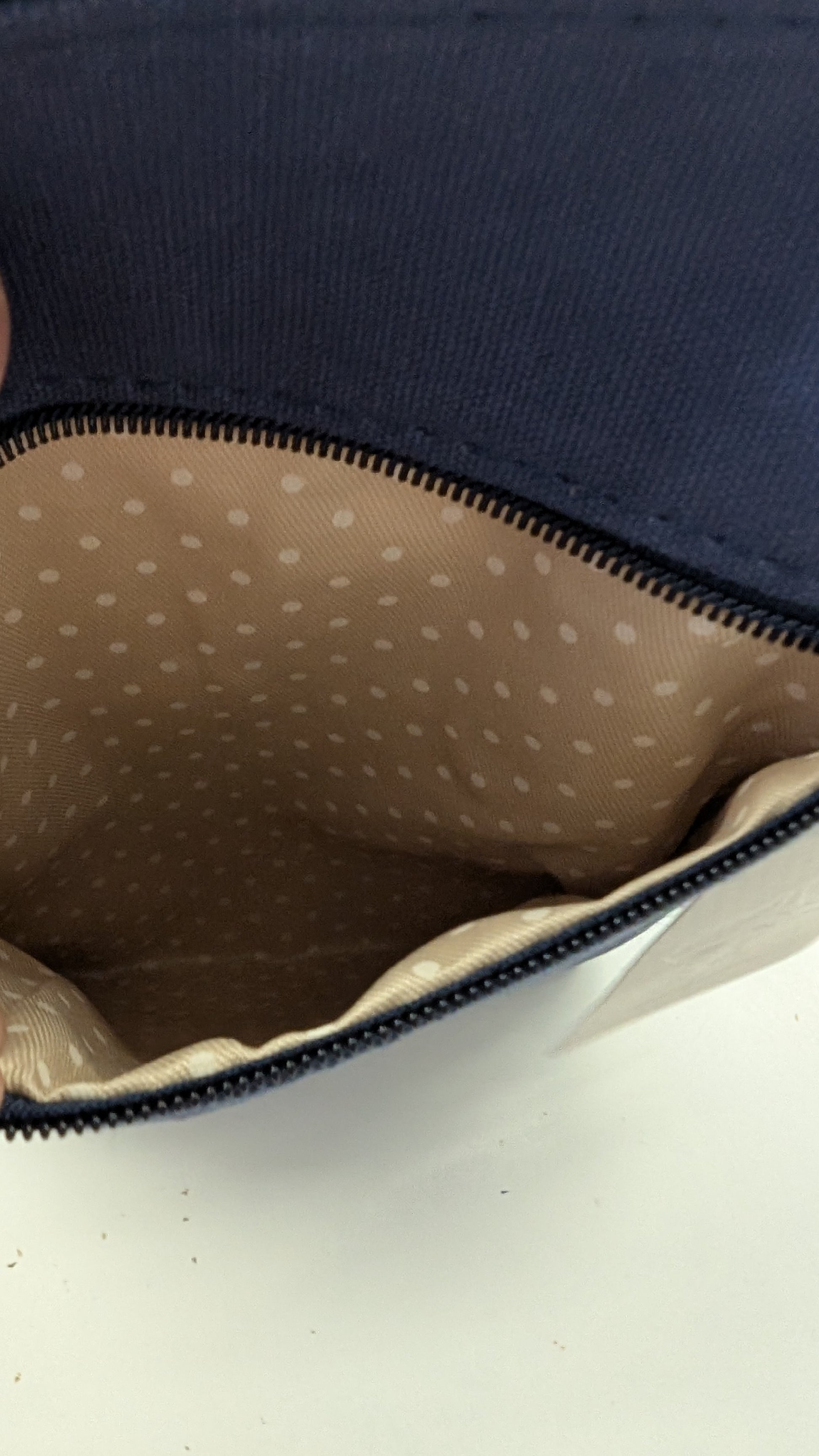 These cotton carry-all bags have a canvas strap that is removable and adjustable, two outer zippers, a snap closure and three inside compartments.