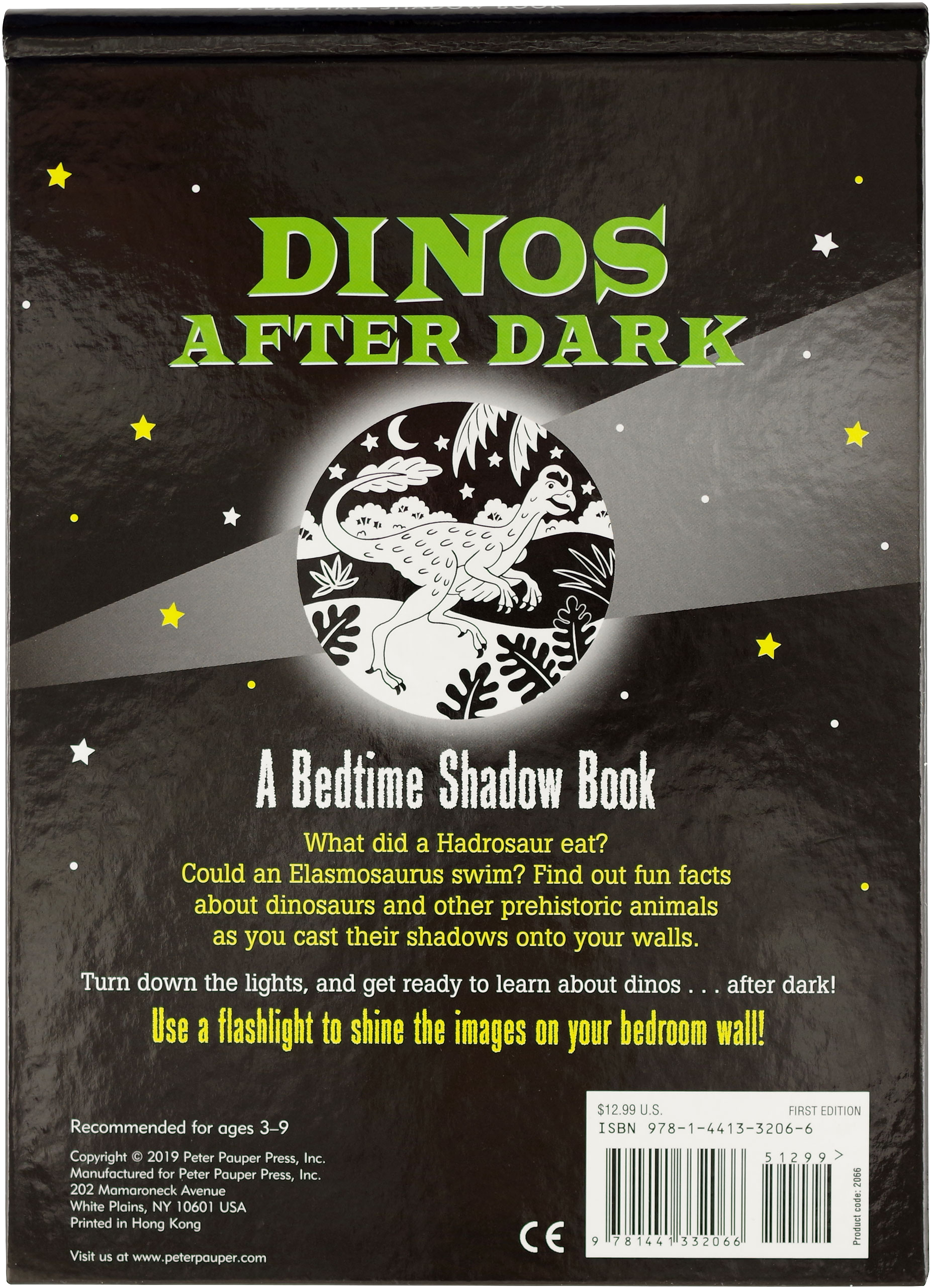 Learn basic facts about seven prehistoric creatures as you cast their shadows on your walls. Turn down the lights, enjoy the simple rhyming text, and learn about dinos . . . after dark! Simply shine the beam of a light (not included) through the ''windows'' on each page to cast the dino pictures on the wall as you read the rhymes within. It's a fun way to end the day and experience a book together. Please note: For best results, use this shadow book with a small, single-bulb light source. A small pen light, other single-LED light, or the light on the back of a smartphone is recommended. Multi-LED flashlights are not recommended. If you have trouble getting a clear image, try moving your light closer to or farther away from the page. Ages 3 to 9. Sturdy covered wire-o hardcover binding. Book measures 6-3/8'' wide x 9'' high.