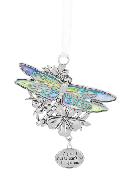 Colorful metal Firefly with dangle charm says, "A Great Nurse Can't Be Forgotten". A White ribbon makes this pretty charm perfect for hanging. Looks great in a car, a window or doorknob.