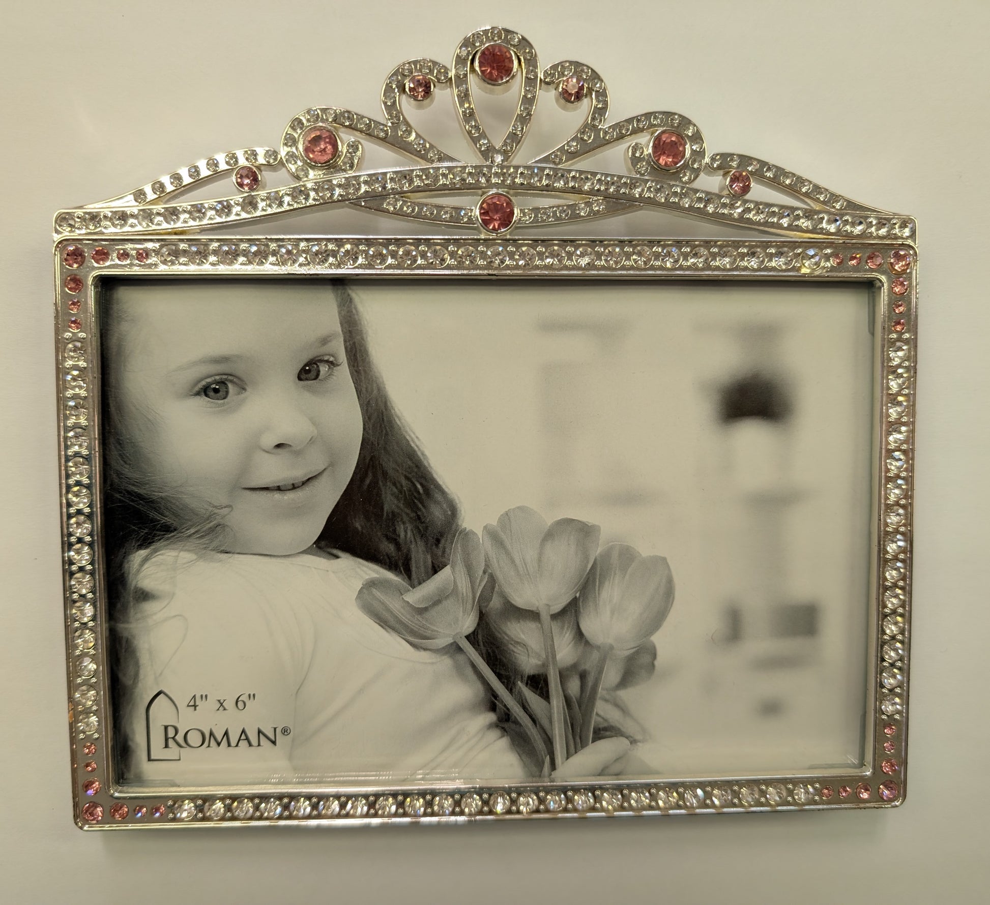 The elegant crown design is accented with shimmering crystal-like jewels that catch the light, while soft pink gems in each corner add the perfect princess touch. It’s a sweet way to display a special photo of your little girl — whether it’s a newborn picture, birthday portrait, or treasured moment.