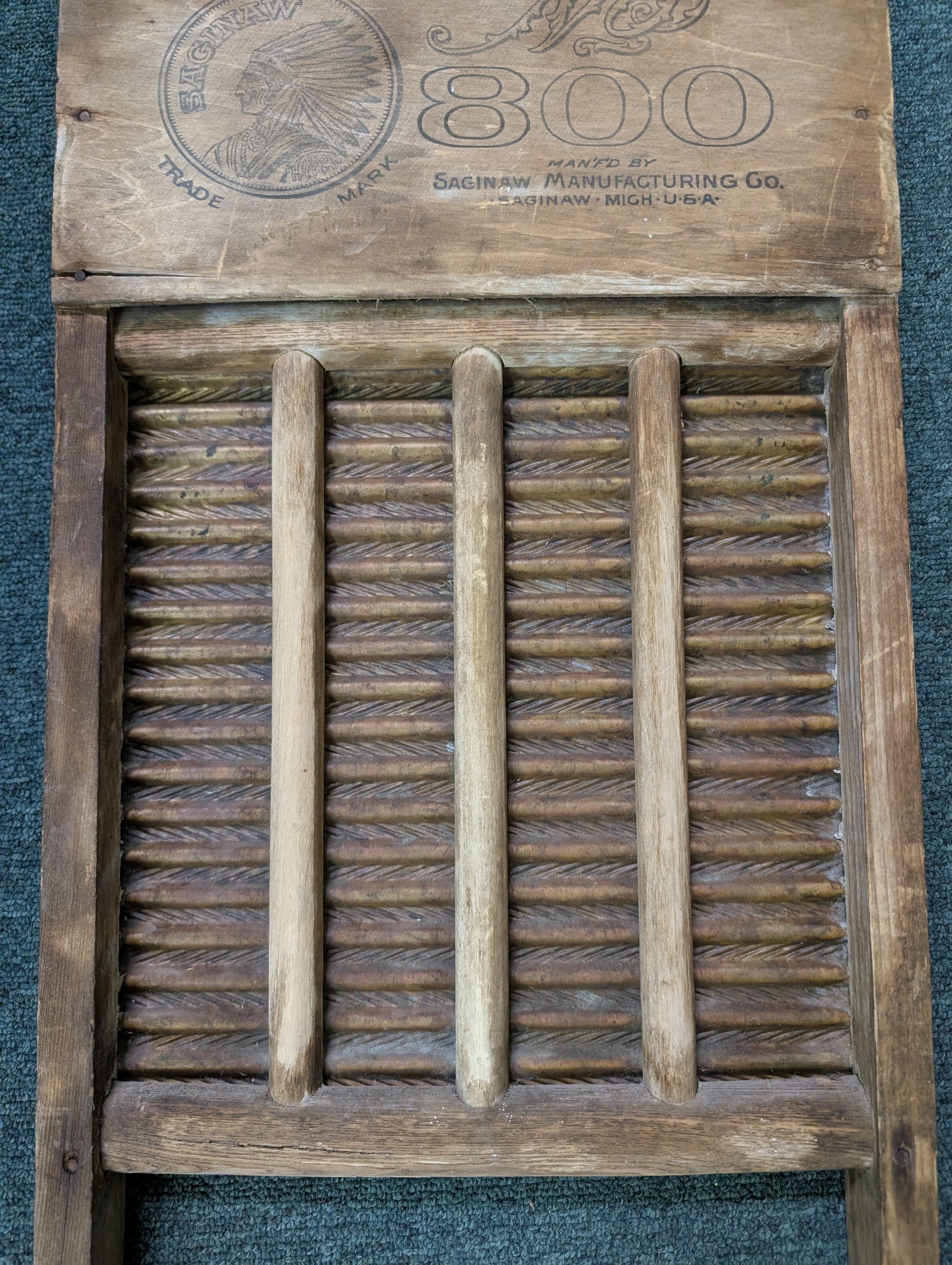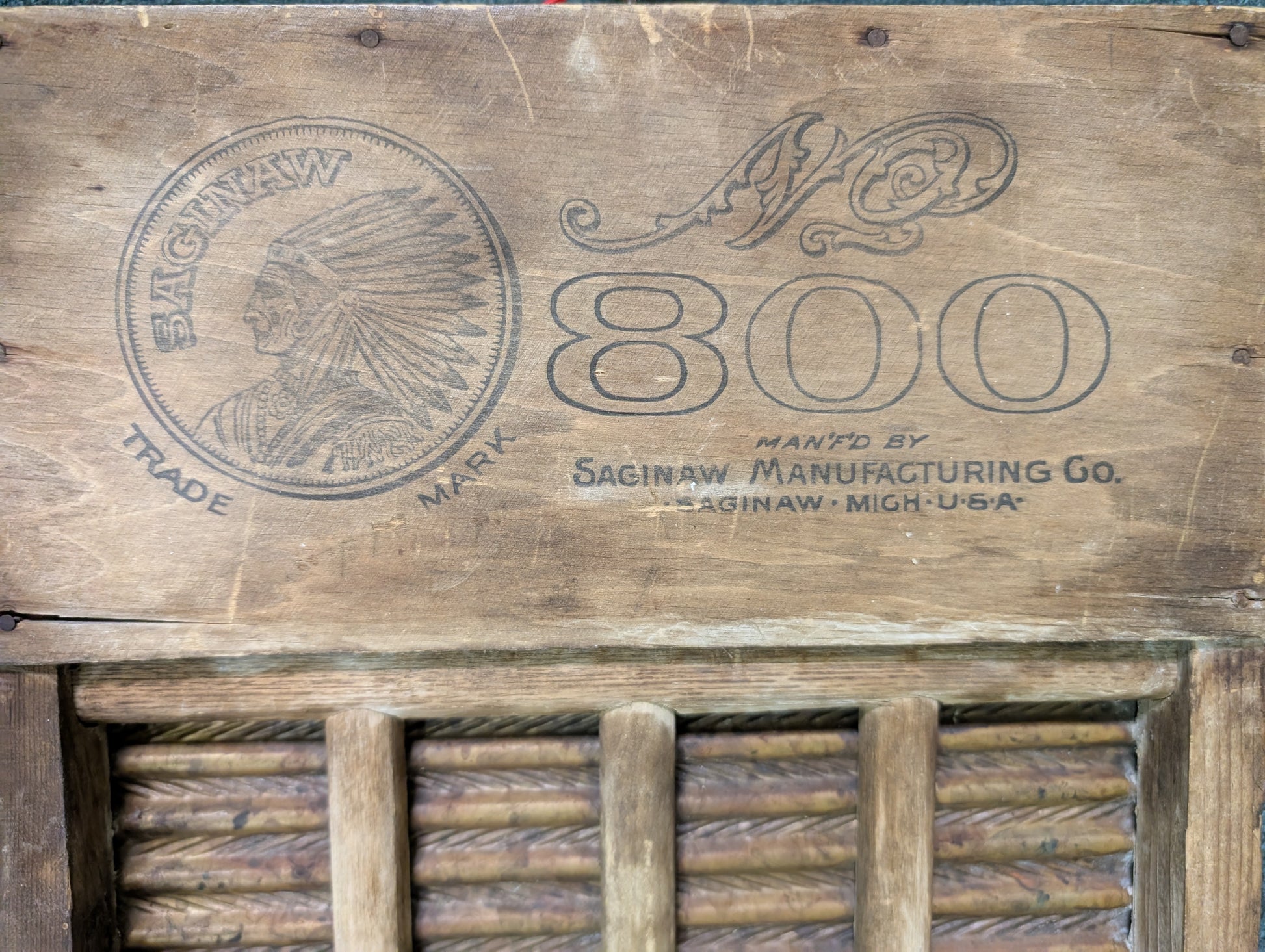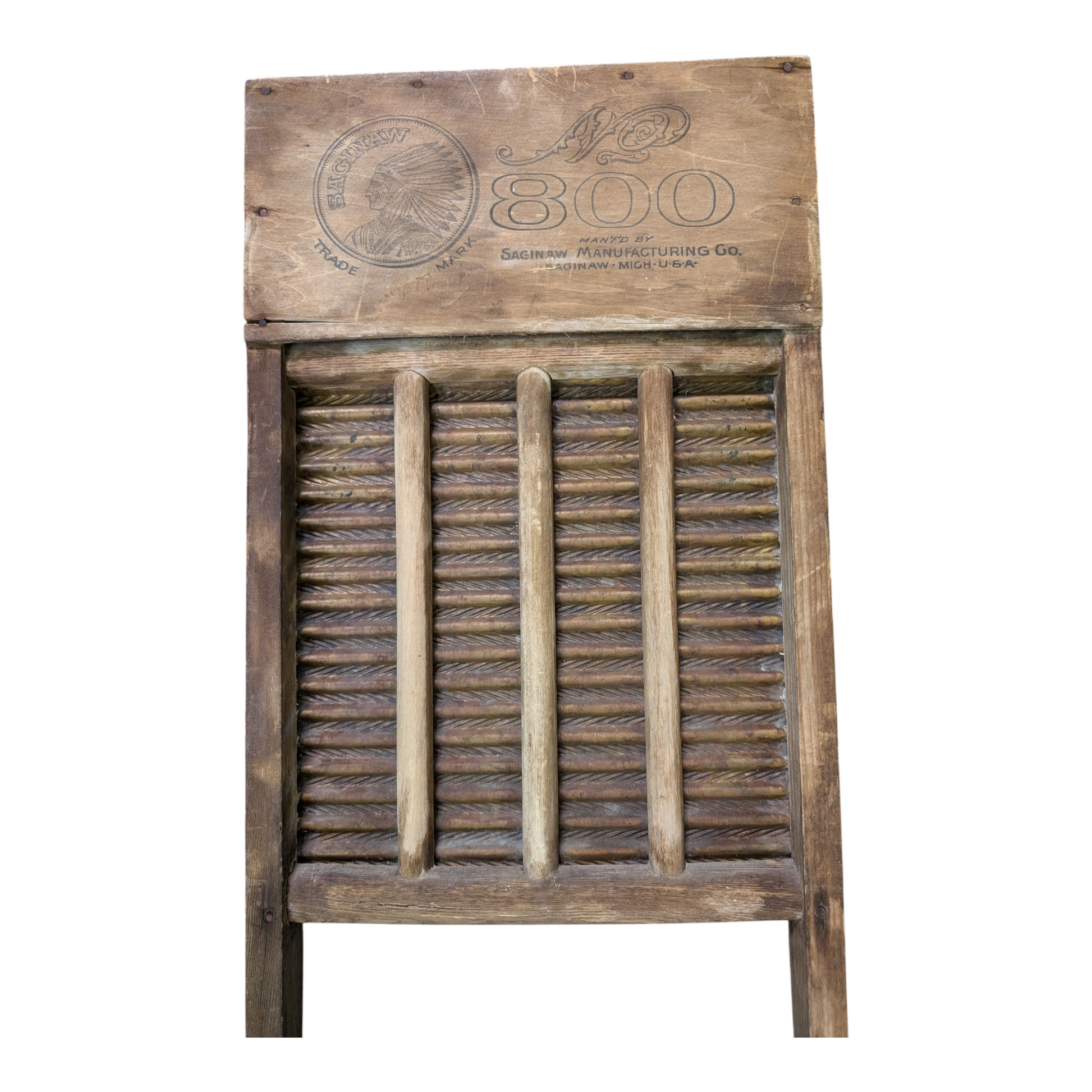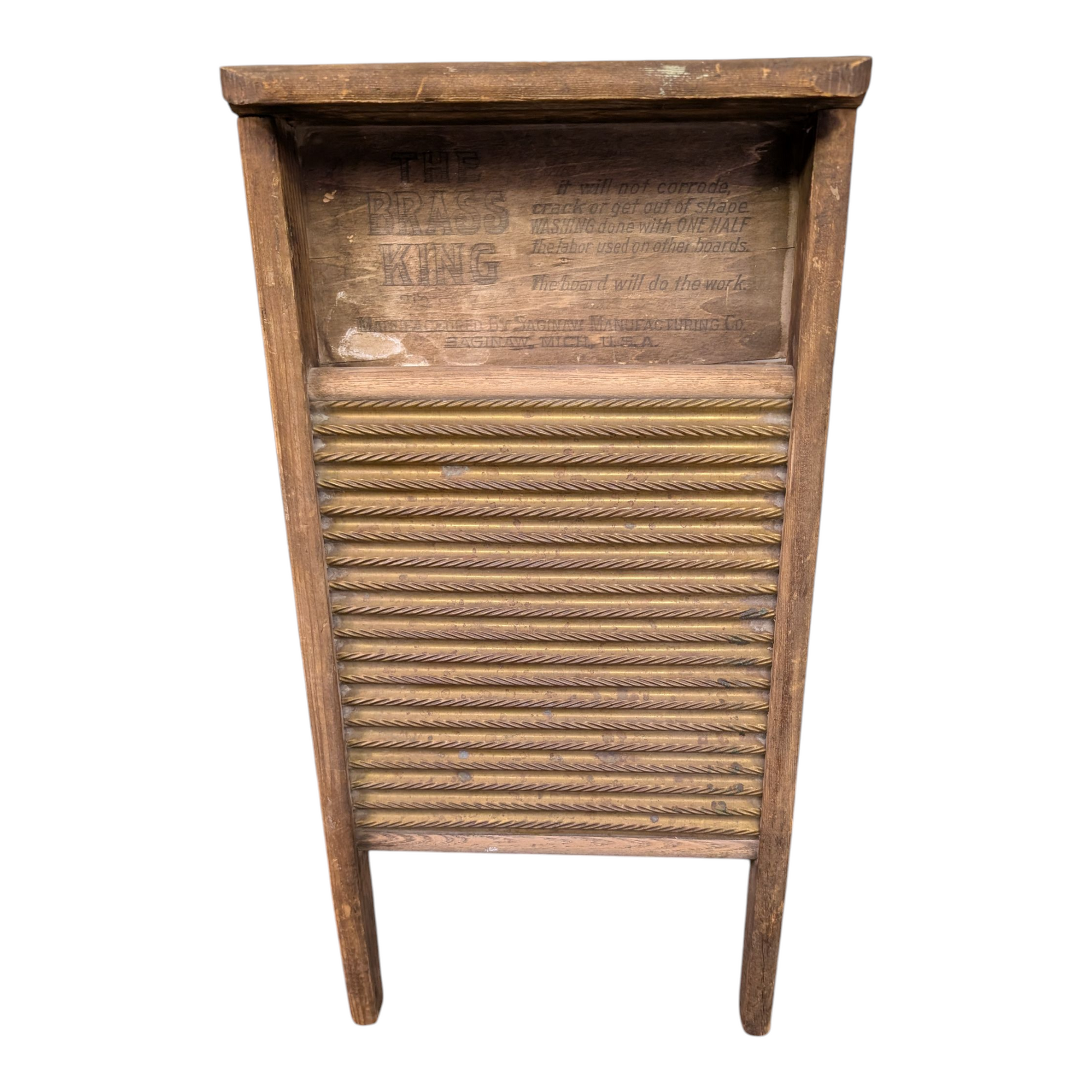 This authentic Brass King Washboard #800, crafted by Saginaw Manufacturing Co. of Saginaw, Michigan, is a well-loved relic from the early 1900s. Bearing the Indian Chief trademark—a design used prior to 1909—it provides a clear window into America’s domestic history.