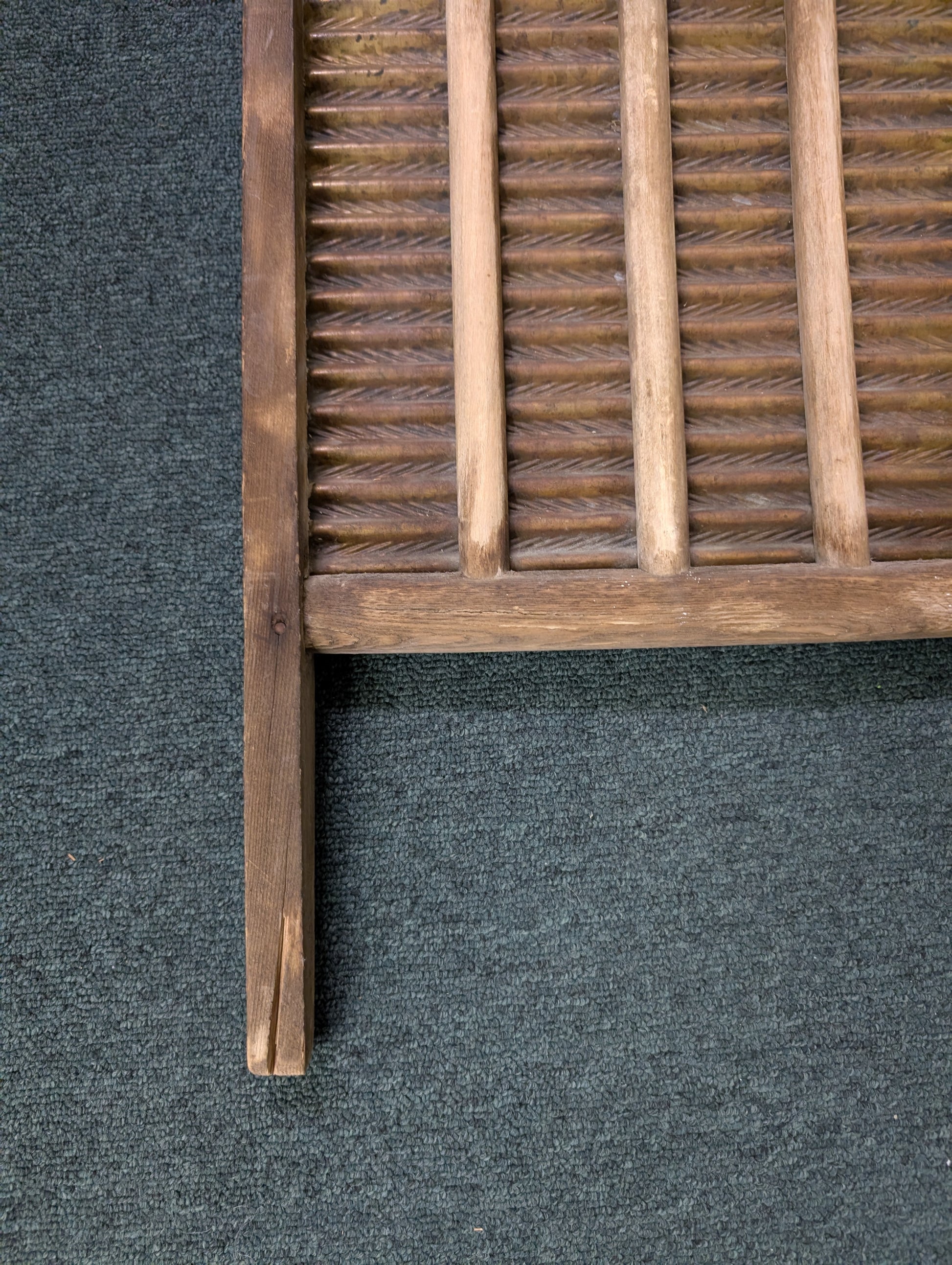 Made with a sturdy wooden frame and a brass scrubbing surface, this board has seen years of faithful service. Its condition is good but not pristine, showing the character and patina of a tool that was truly used and appreciated in its time. The brass retains its distinctive shine beneath the wear, while the original markings remain visible.